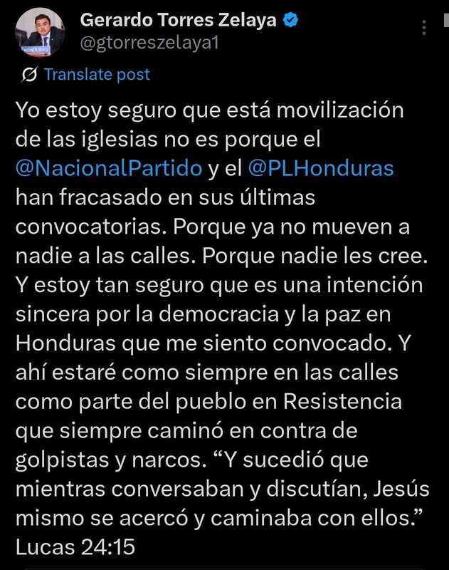 “Estoy seguro de que esta movilización no es porque el Partido Nacional y el Partido Liberal han fracasado en sus convocatorias. Estoy tan convencido de que es una intención sincera por la democracia y la paz en Honduras que me siento convocado. Y ahí estaré, como siempre, en las calles como parte del pueblo en Resistencia”, expresó.