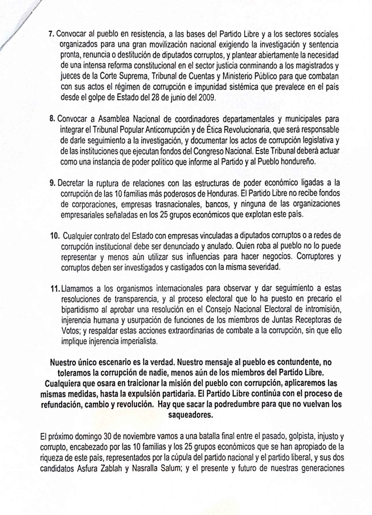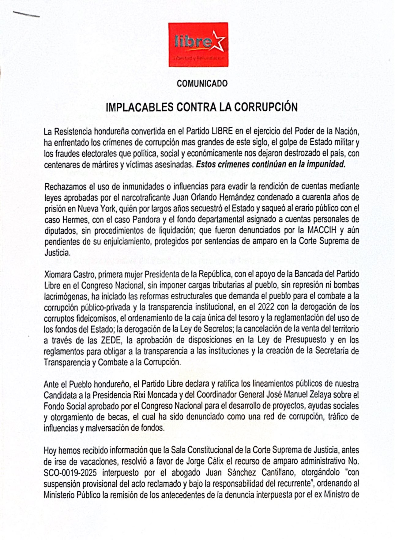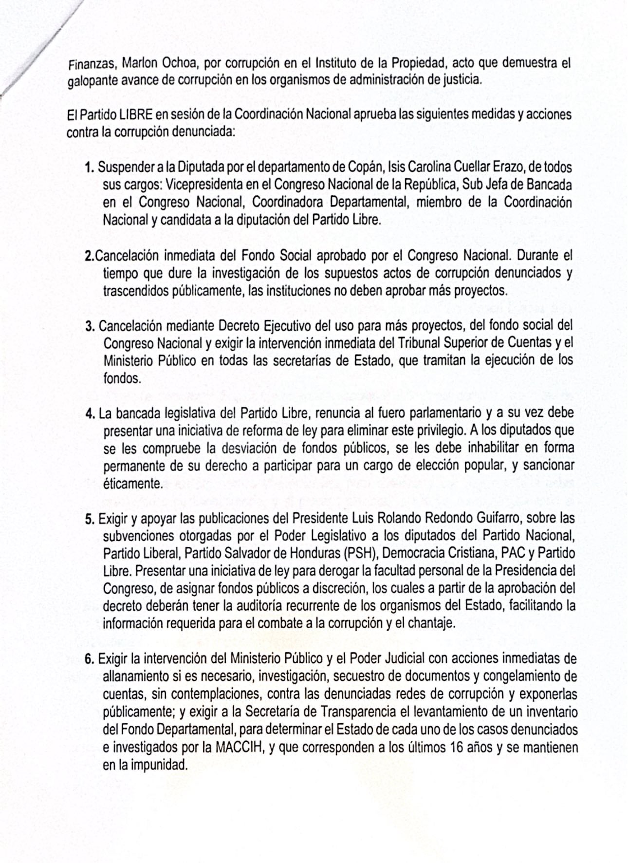 Libre además exigió la intervención del Tribunal Superior de Cuentas (TSC) y el Ministerio Público (MP) para auditar el manejo de recursos públicos. También pidió la renuncia de la bancada legislativa al fuero parlamentario, con la propuesta de eliminar este privilegio legal.