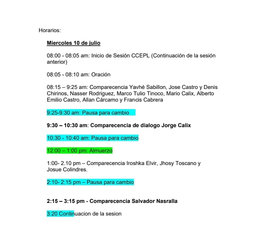 La audiencia de comparecencia iniciará alrededor de las 8:15 de la mañana en la sede del Partido Liberal de Honduras en Tegucigalpa, Francisco Morazán. Primero, analizarán la integración de Cálix y sus integrantes; luego seguirán con Nasralla y sus miembros.
