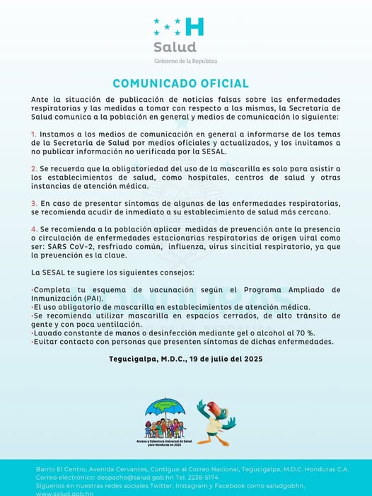 Las enfermedades respiratorias que circulan actualmente en Honduras son: covid-19, resfriado común (gripe), influenza y virus sincitial respiratorio. Las recomendaciones de la Sesal son las siguientes: