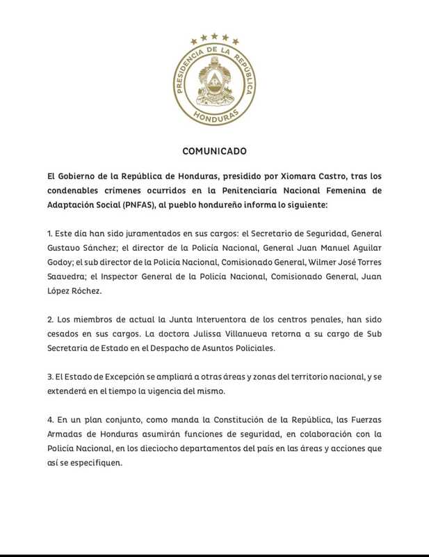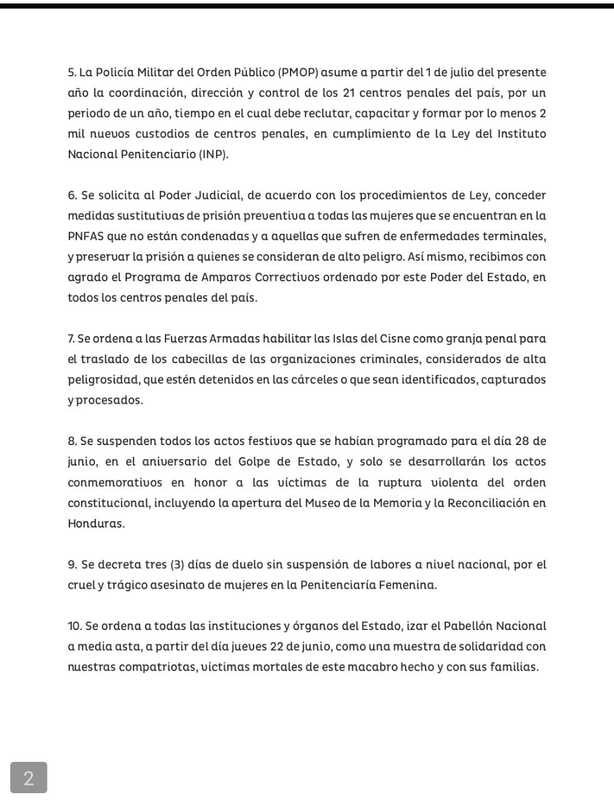 «Se decreta tres días de duelo sin suspensión de labores a nivel nacional, por el cruel y trágico asesinato de mujeres en la Penitenciaría», señala el escrito.