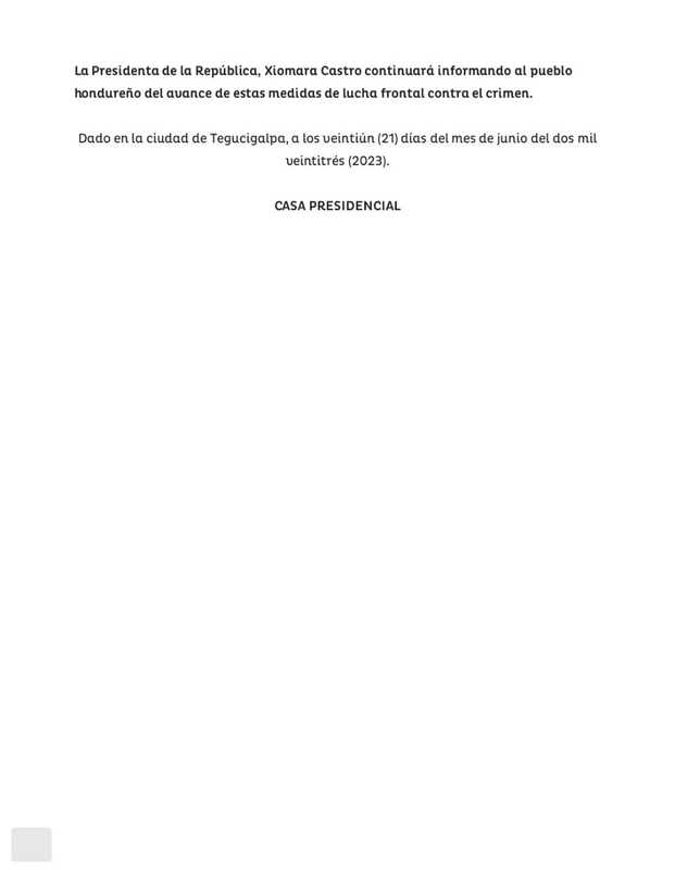 Otra medida anunciada es que el estado de excepción se ampliará a otras áreas y zonas del territorio nacional, además, se extenderá en el tiempo la vigencia del mismo. También, las Fuerzas Armadas de Honduras asumirán funciones de seguridad, en colaboración con la Policía Nacional.