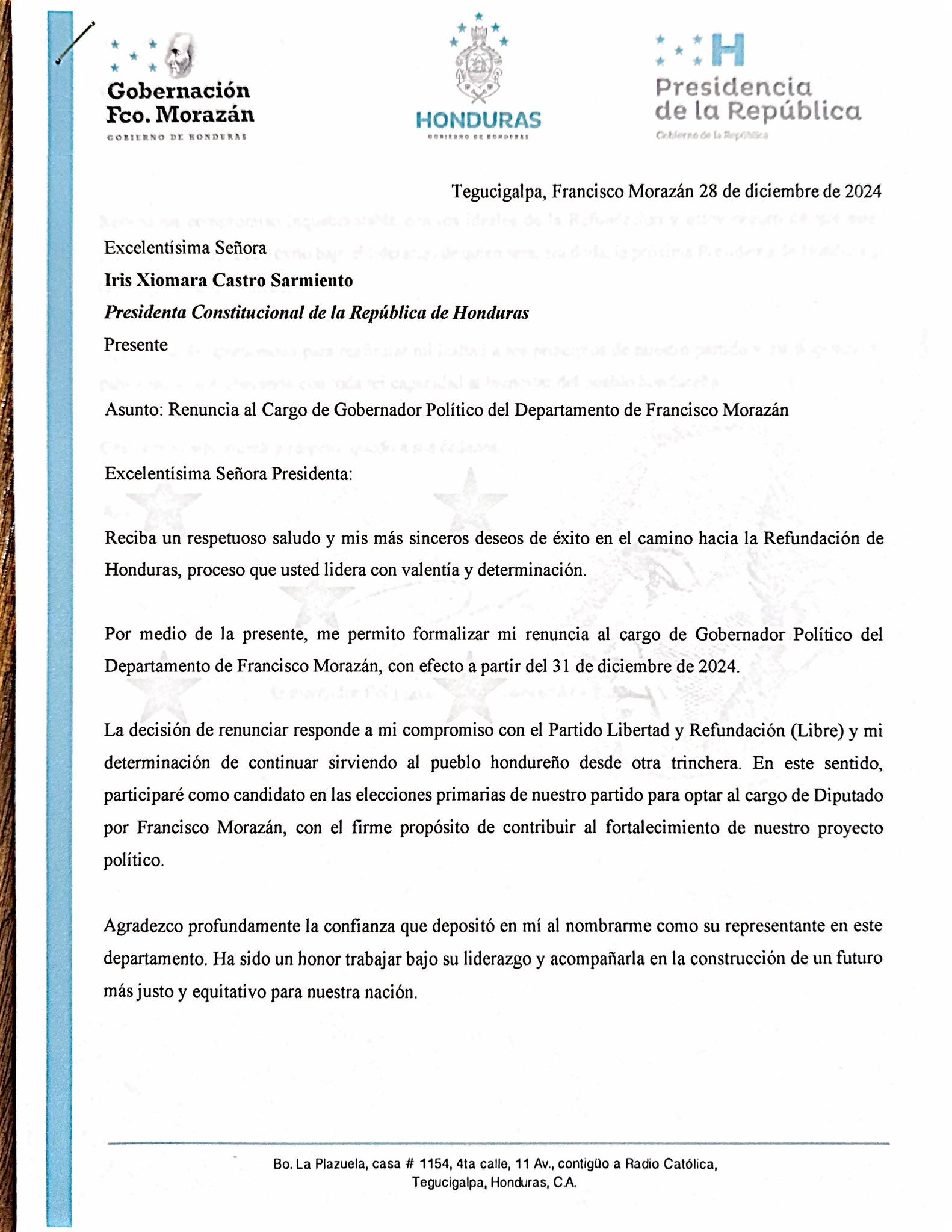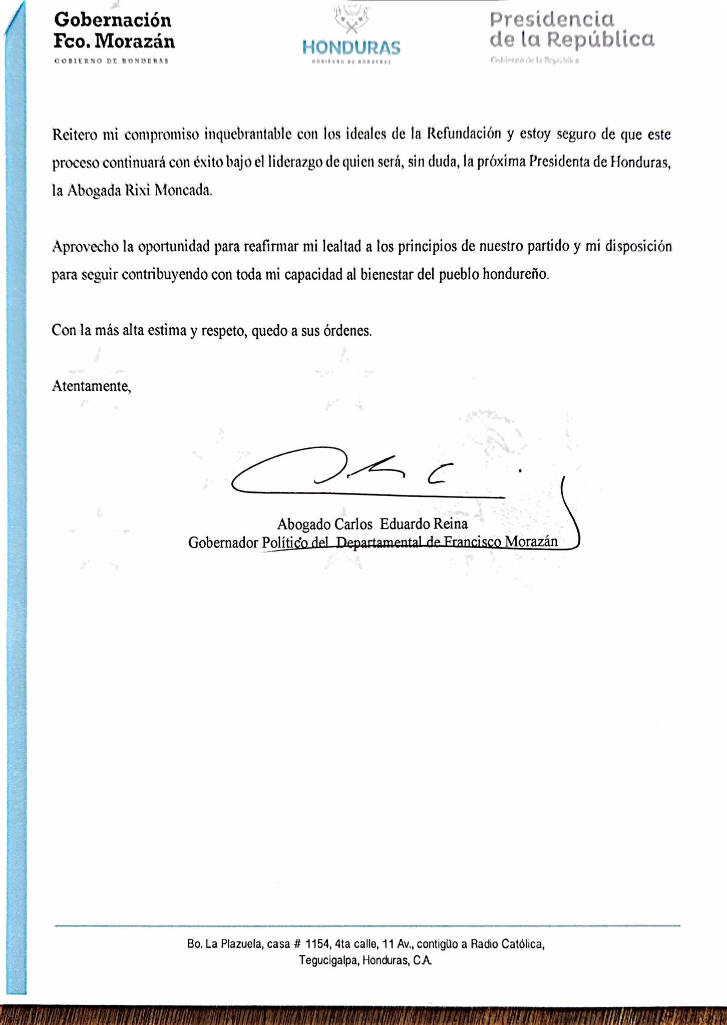 La carta concluye con un mensaje de gratitud hacia la presidenta Castro por el apoyo brindado durante su desempeño como gobernador político. Además, aseguró que continuará trabajando por un futuro más justo y equitativo para Honduras.