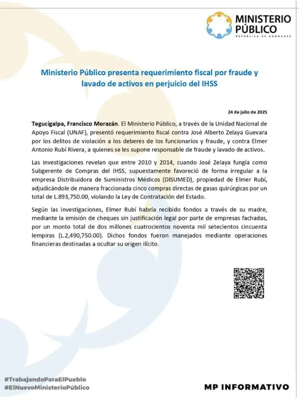Redacción. El Ministerio Público, a través de la Unidad Nacional de Apoyo Fiscal (UNAF), presentó un nuevo requerimiento fiscal por presuntos actos de corrupción en perjuicio del Instituto Hondureño de Seguridad Social (IHSS).