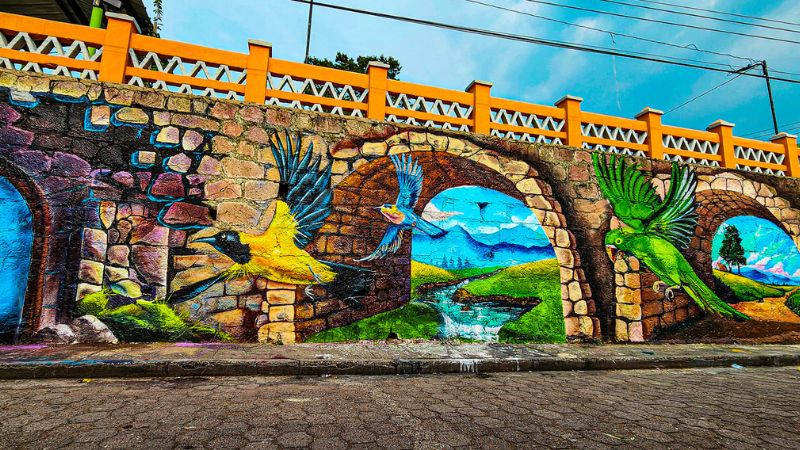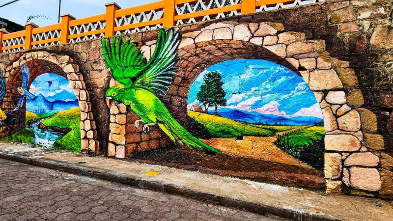 Para lograr estas fascinantes obras de arte usaron la textura de la piedra de cantera a fin de recrear arcos de medio punto, proyectados con un punto de fuga. El mural principal muestra un paisaje montañoso de fondo, aves nacionales llenas de color volando bajo los arcos y que dan la sensación de un puente.