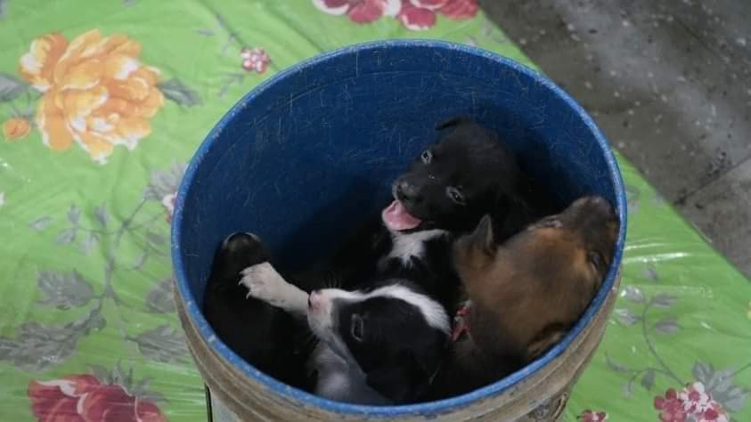 Se trata de un menor de aproximado 10 años que, junto a su familia, fue movilizado a un albergue. Al ver que debían irse de su vivienda, él sabía que no podía abandonar a sus tres cachorros, por lo que tomó un balde y metió a su perritos para protegerlos.