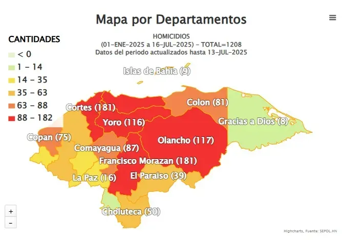 El sistema reportó que, hasta el 13 de julio, 117 personas murieron de forma violenta en Olancho en lo que va de 2025; 99 eran varones y 18 mujeres. Pero la cifra sigue aumentando, pues en las últimas horas se registraron nuevos asesinatos.