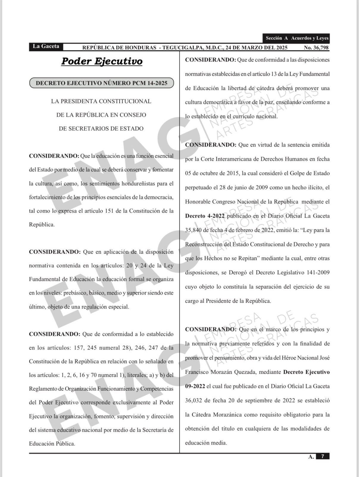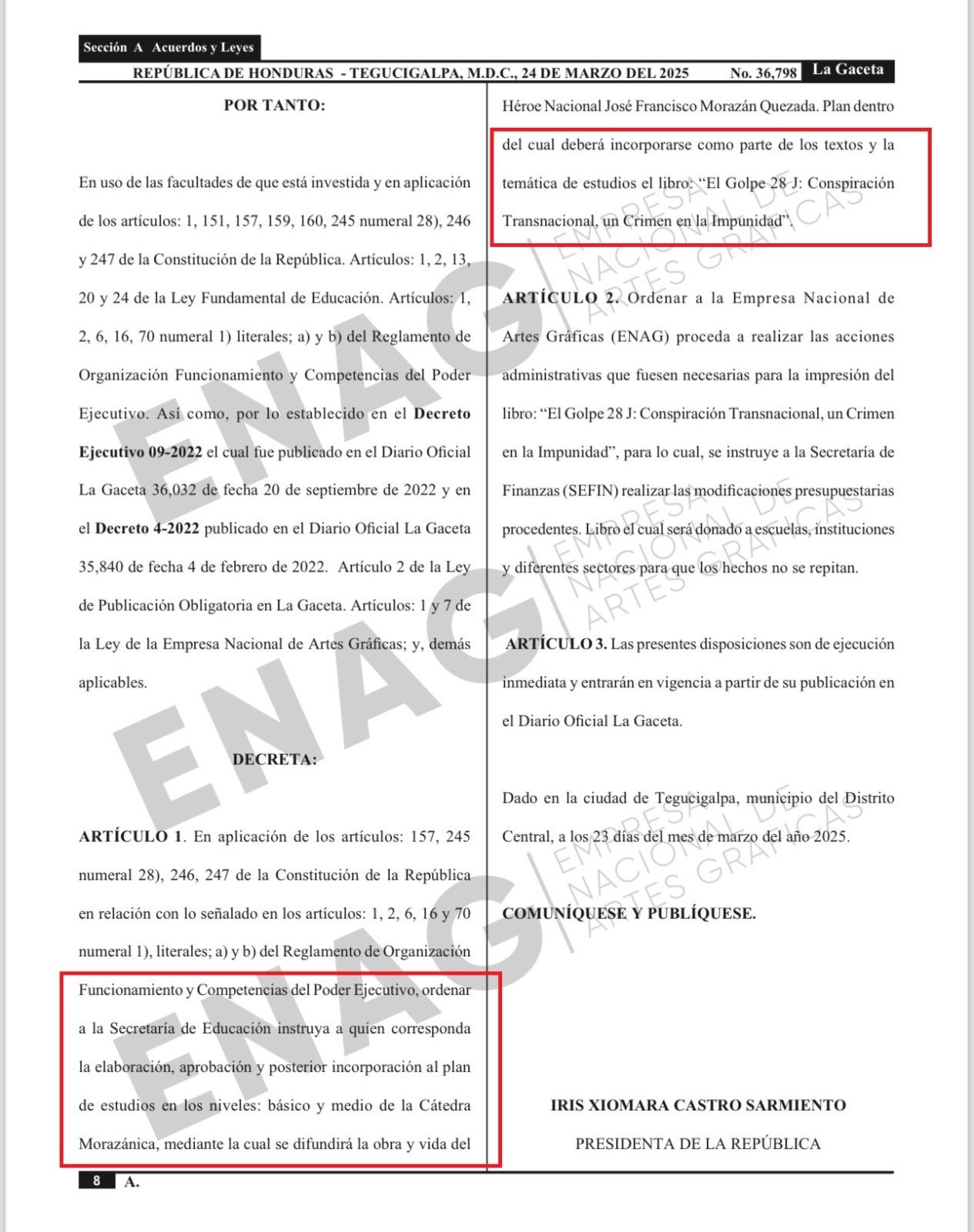 El decreto instruye a la Empresa Nacional de Artes Gráficas (ENAG) a tomar las acciones necesarias para imprimir el texto, que será impartido en los niveles básico y medio dentro de la Cátedra Morazánica.