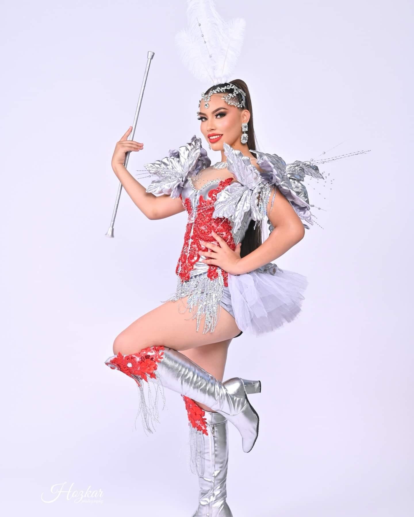 El traje, al que su diseñador Andony Aguilar bautizó como “Mujer Plata del Pacífico» estuvo inspirado en una flor popular del municipio, la cual se caracteriza por el color rojo.