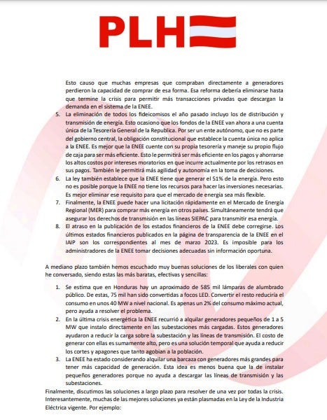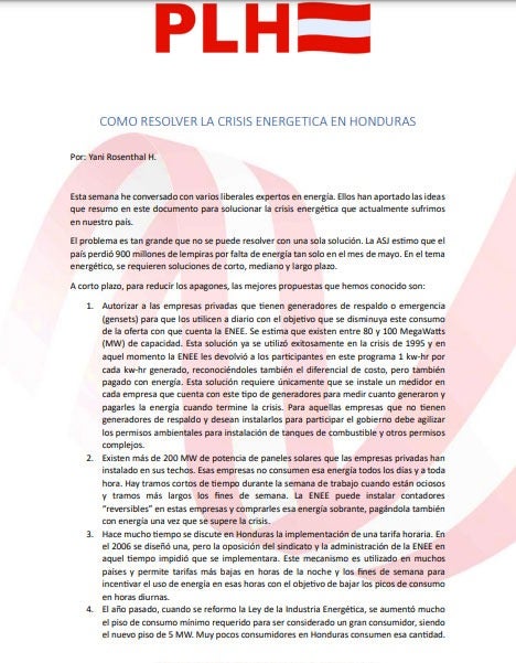 En el comunicado, titulado «Cómo resolver la crisis energética en Honduras», los liberales sostienen que estas estrategias se podrían utilizar en este momento difícil, puesto que las mismas rindieron frutos cuando se usaron en la crisis energética en 1995.