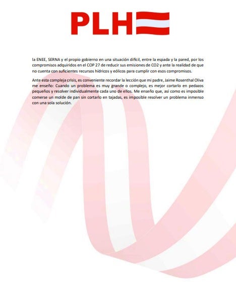 Redacción. Yani Rosenthal, presidente del Consejo Central Ejecutivo del Partido Liberal (CCEPL), presentó este jueves un comunicado en el que el Partido Liberal de Honduras (PL) ofrece 14 recomendaciones para superar la crisis energética que aqueja a Honduras. Estas soluciones están divididas en tres partes: a corto, mediano y largo plazo.