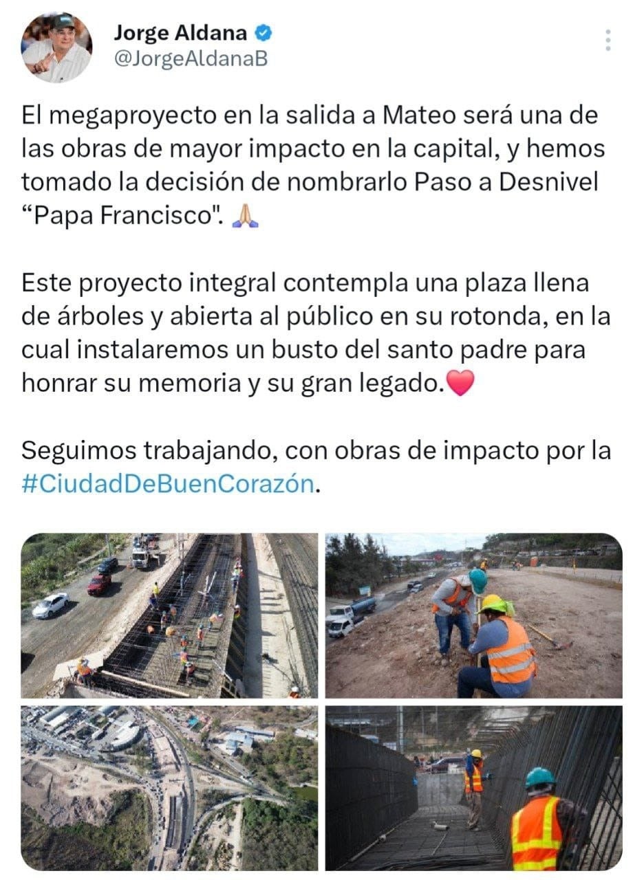 El anuncio fue confirmado en exclusiva para Diario Tiempo por el alcalde del Distrito Central, Jorge Aldana, quien destacó que el nombramiento se realiza en honor al Sumo Pontífice, por su compromiso con los más desfavorecidos y su mensaje de paz y solidaridad.