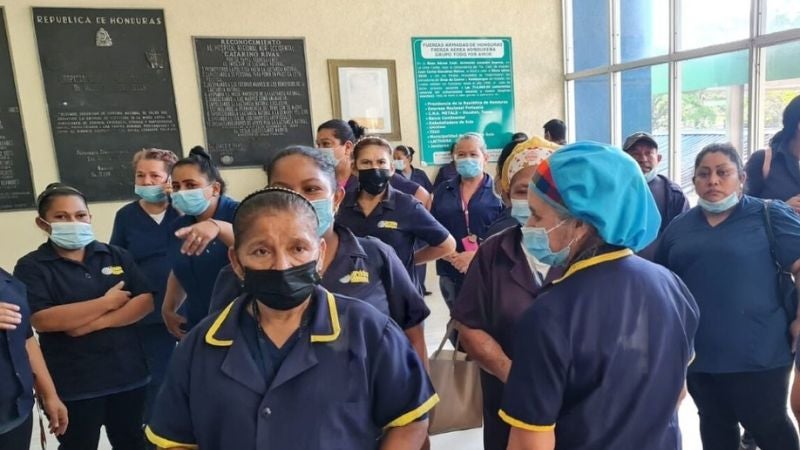 Redacción. Empleados del área de limpieza del Hospital Mario Catarino Rivas, en San Pedro Sula, realizaron un plantón para exigir que se les paguen los meses de salarios atrasados que les adeudan.