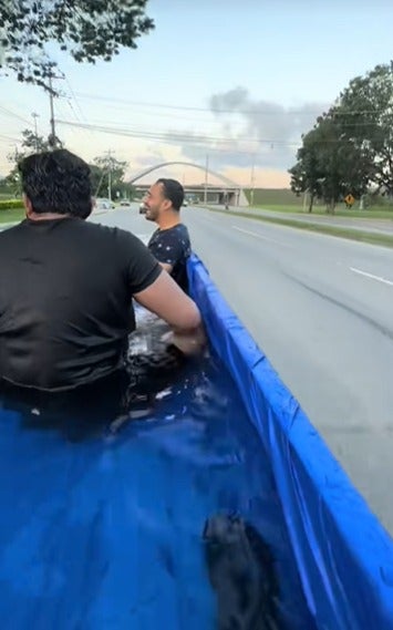 Cinco amigos colocaron un enorme plástico azul en la parte trasera del vehículo, lo llenaron con varios litros de agua y se subieron a bordo para dar un paseo por las calles de la ciudad. Entre risas, saludos a otros conductores y mucha creatividad, el curioso momento quedó grabado en video.