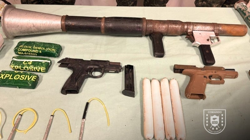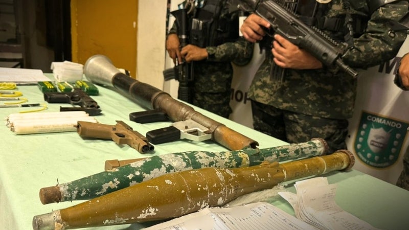 También decomisaron un lanzacohetes tipo RPG-7, dos granadas para RPG-7, una carga de explosivos cebada, tres barras de explosivo C-4 (uso militar), cuatro barras de explosivo Emulex (uso comercial) y dos pistolas calibre 9 mm con sus respectivos cargadores.