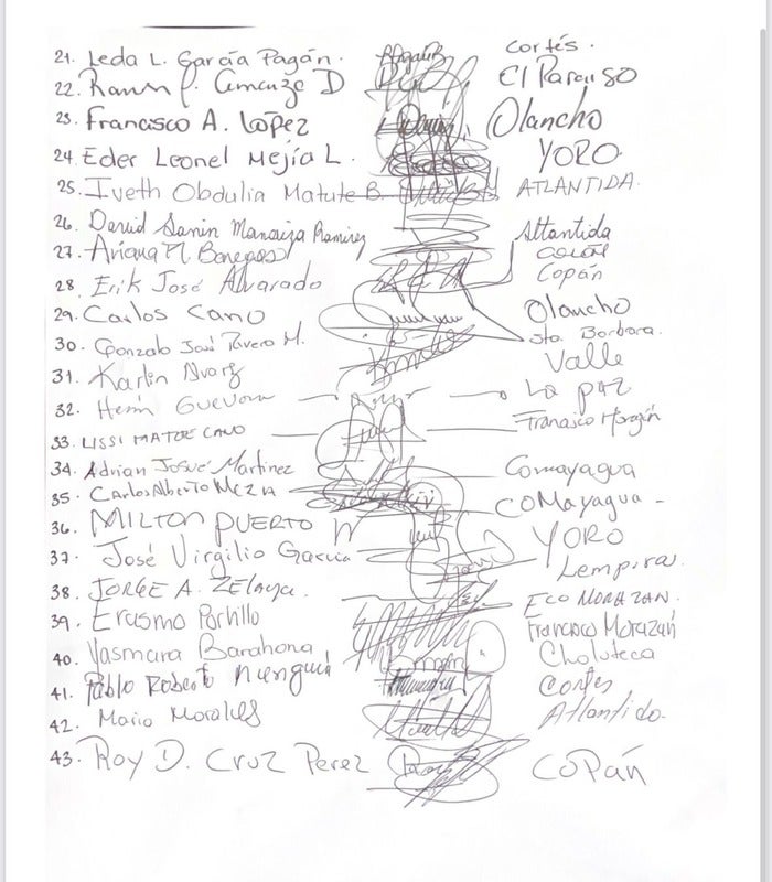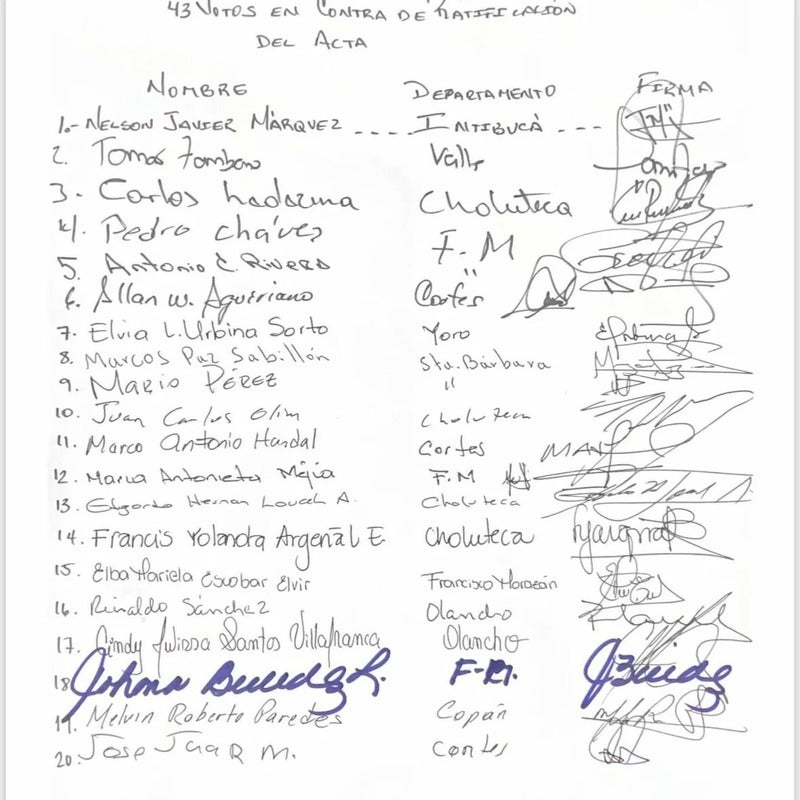 Mediante una lista titulada: «43 votos en contra de ratificación del acta», los diputados de los diferentes departamento estamparon su nombre y su firma.