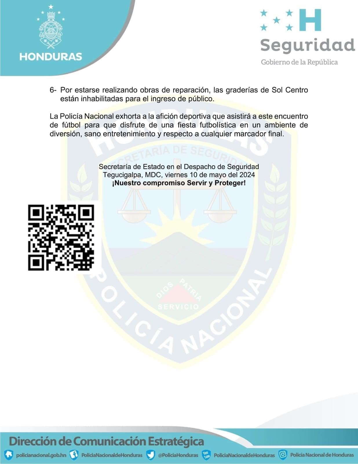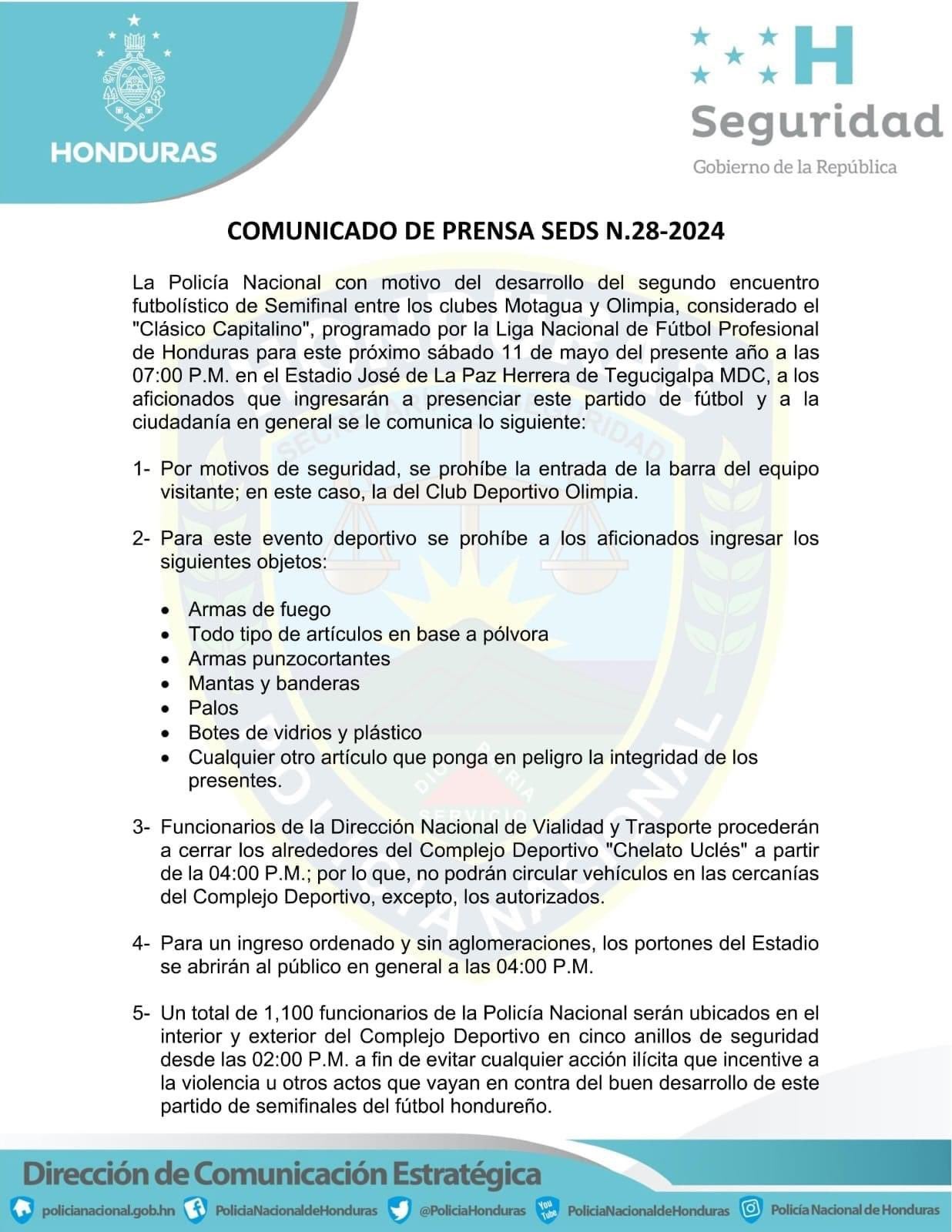Sobre la seguridad, un total de 1,100 funcionarios policiales formarán cinco anillos de seguridad y se desplazarán antes y durante el clásico del fútbol hondureño.