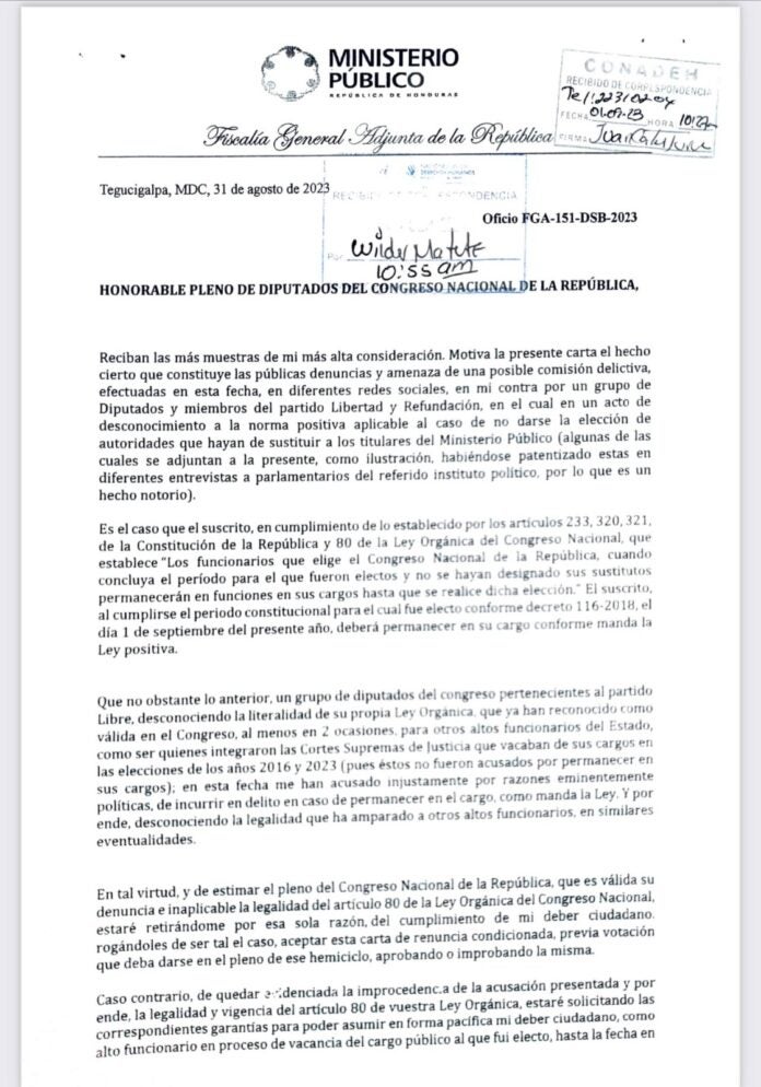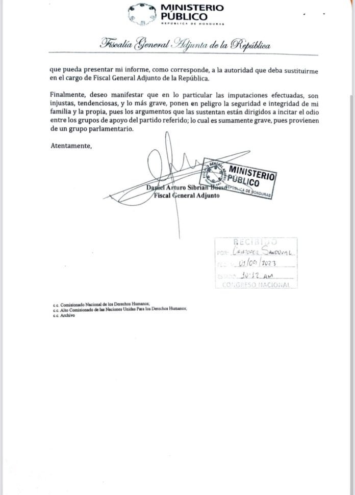 El fiscal adjunto Sibrián Bueso presentó su carta de renuncia al Congreso Nacional, para su posterior aprobación mediante votación, conforme a lo establecido en la Ley.