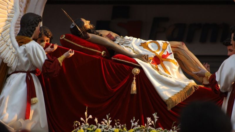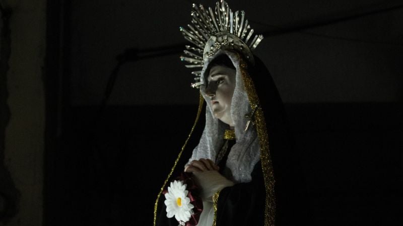 Asimismo, se ve la imagen de Jesucristo tras su muerte, la cual es llevada dentro de una urna y detrás va su madre, María, que es la imagen de La Dolorosa y su gran manto negro y resplandeciente.