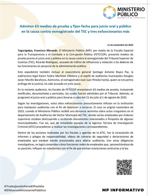 «Este expediente también incluye al ex secretario general Santiago Antonio Reyes Paz, la ex directora legal Karen Yadira Martínez y el ex jefe de auditorías municipales Douglas Javier Murillo Barahona», detalló. El exmagistrado Juan José Pineda Varela, quien permanece como prófugo de la justicia, también está vinculado en el proceso.