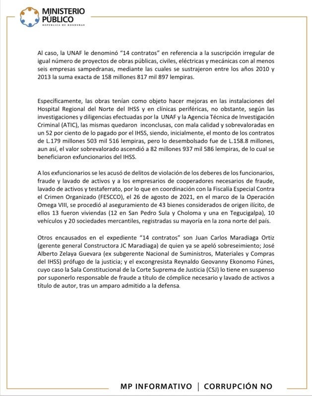 Otros encausados en el expediente “14 contratos” son Juan Carlos Maradiaga Ortiz (gerente general Constructora JC Maradiaga), de quien ya se apeló sobreseimiento. Así mismo, José Alberto Zelaya Guevara (ex subgerente Nacional de Suministros, Materiales y Compras del IHSS), aún prófugo de la justicia.