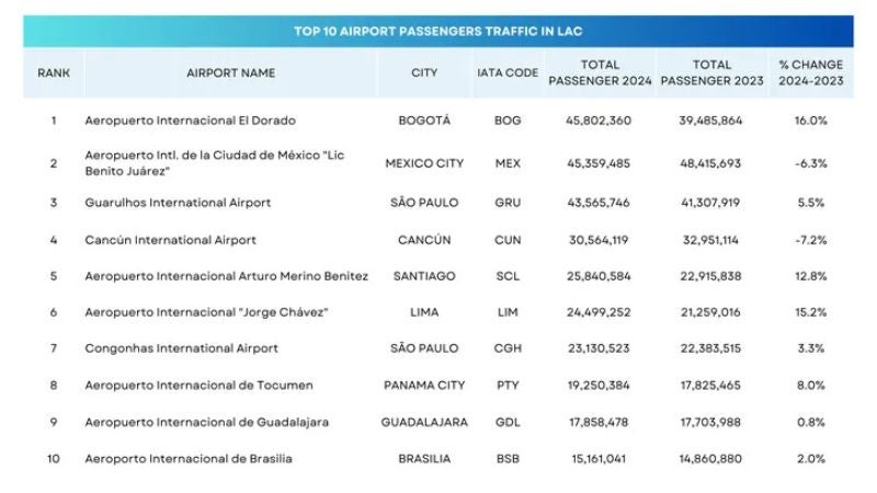 La nueva edición del ranking regional, en lo que hace al tráfico, posicionó a los máximos escalones al aeropuerto colombiano de El Dorado. Este aeropuerto movilizó en 2024 un total de 45,8 millones de pasajeros, con un crecimiento de 16% contra los resultados de 2023.