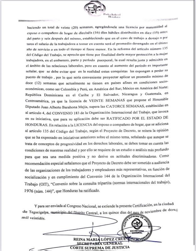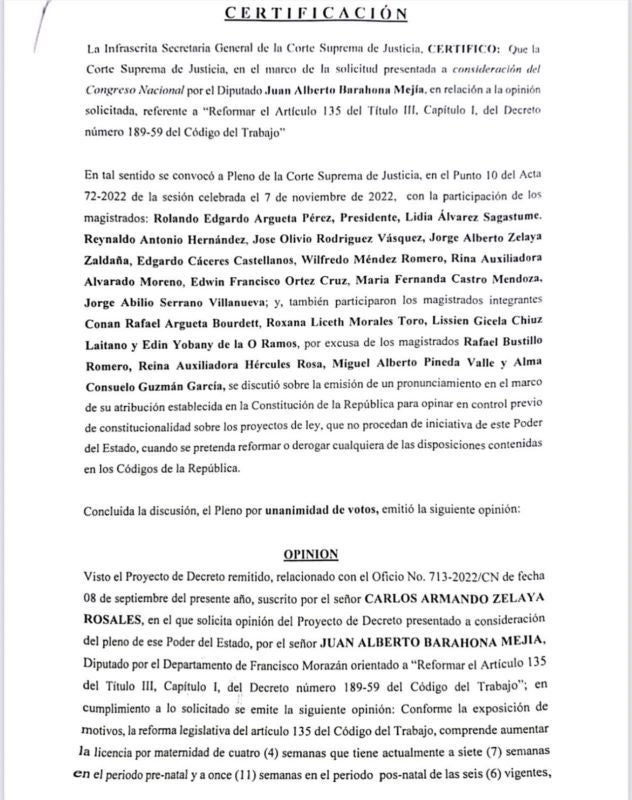 La anterior Corte Suprema de Justicia (CSJ) se pronunció de manera desfavorable ante la propuesta de Barahona desde el pasado mes de noviembre del 2022. Según el documento emitido y por unanimidad de votos, el Poder Judicial (PJ) consideraba que no era necesario una ampliación del periodo de pre y postnatal a las madres.