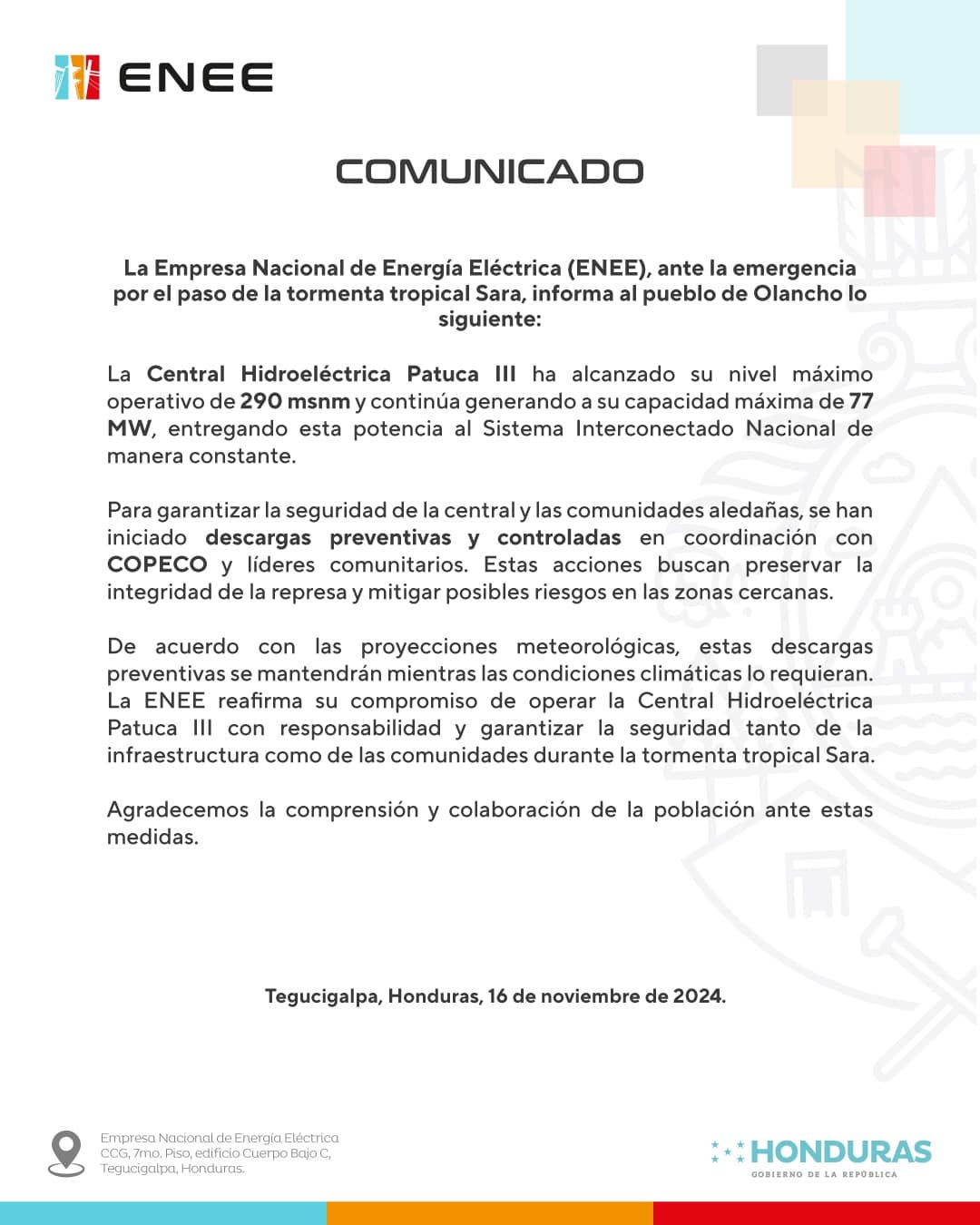 «La ENEE reafirma su compromiso de operar la central hidroeléctrica de Pauca III con responsabilidad y garantizar la seguridad tanto de la infraestructura como de las comunidades durante la tormenta tropical», indicó la estatal.