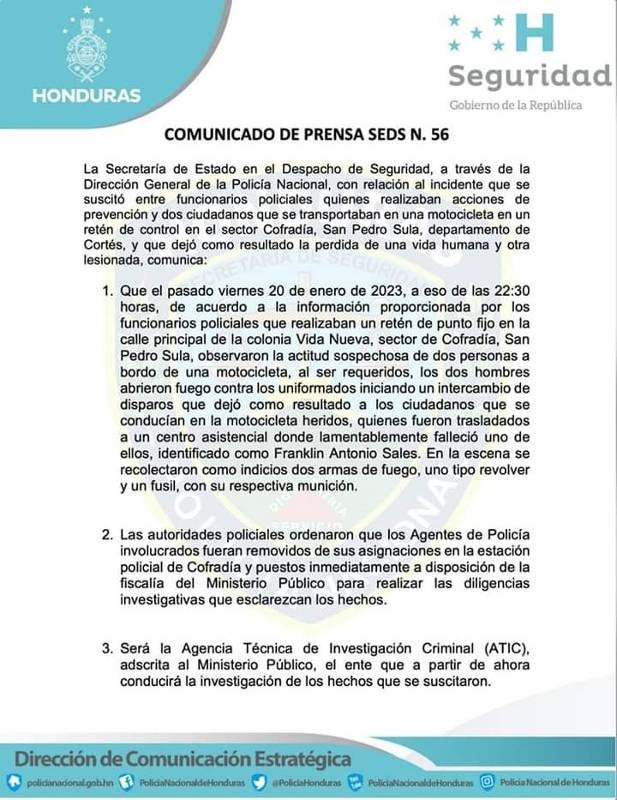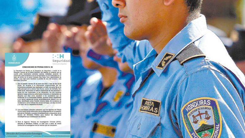 Tegucigalpa, Honduras.– La Policía Nacional de Honduras removió de sus cargos a funcionarios policiales que participaron en un enfrentamiento suscitado el pasado viernes contra dos ciudadanos que se transportaban en una motocicleta, y que dejó como resultado la pérdida de una vida humana y otra lesionada.