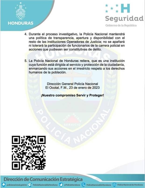 «Durante el proceso investigativo, la Policía Nacional mantendrá una política de transparencia, apertura y disponibilidad con el resto de las instituciones Operadoras de Justicia; no se apañará ni tolerará la participación de funcionarios de la carrera policial en