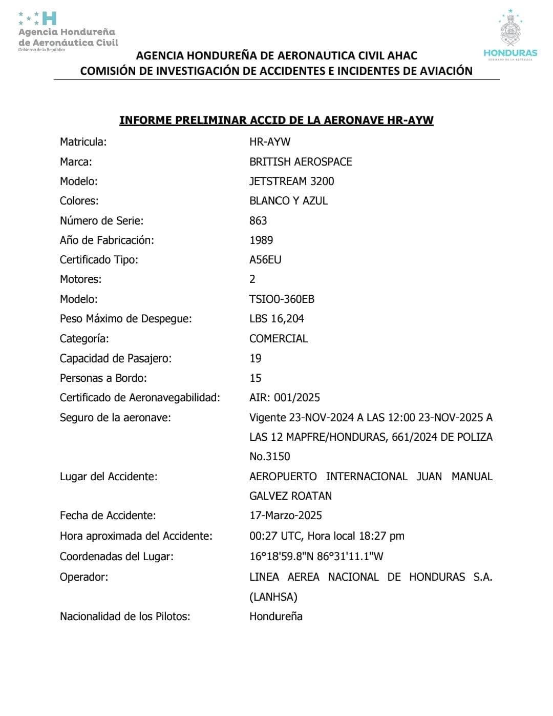 De igual interés: Divulgan informe preliminar sobre accidente aéreo en Roatán