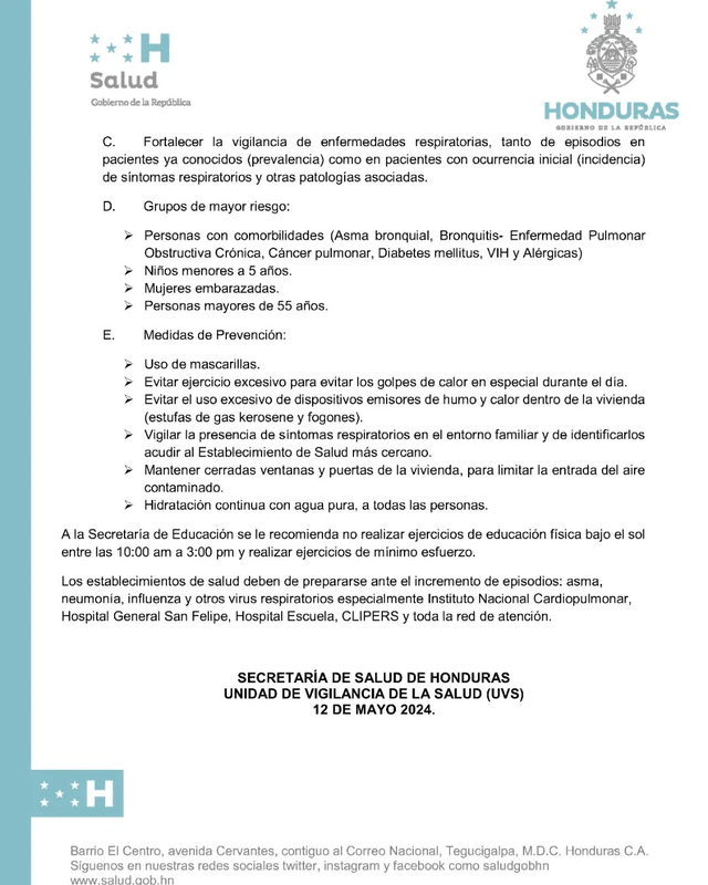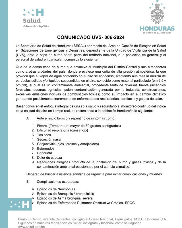 Redacción. La Secretaría de Salud de Honduras (Sesal) solicitó a la población buscar atención médica si presenta síntomas por la capa de humo que cubre Tegucigalpa y otras partes del territorio nacional.