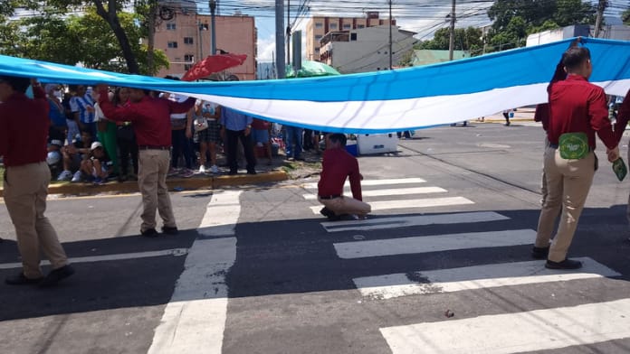 Un estudiante de un instituto sampedrano se las ingenió, y decidió refugiarse bajo la enorme bandera de Honduras que llevaban sus compañeros en las 1ra calle de San Pedro Sula.
