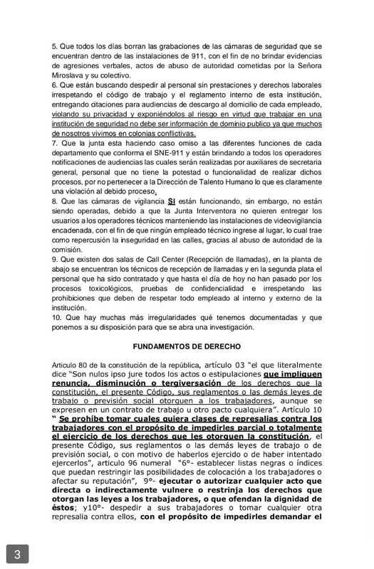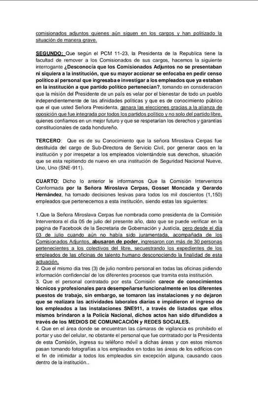 Los empleados del Sistema Nacional de Emergencias (911), a través de un comunicado, pidieron a la presidenta Xiomara Castro que se elimine a la Comisión interventora que preside Miroslava Cerpas. Esto por una serie de irregularidades cometidas dentro de la institución.