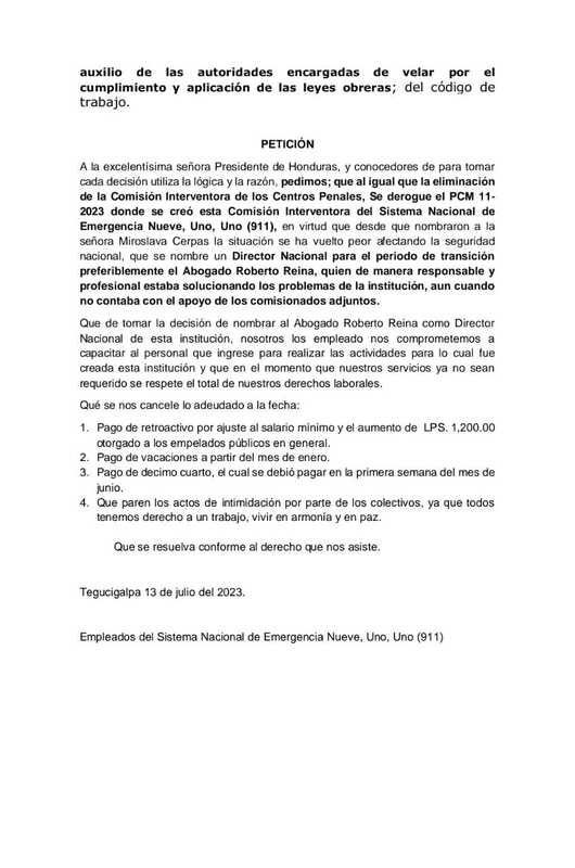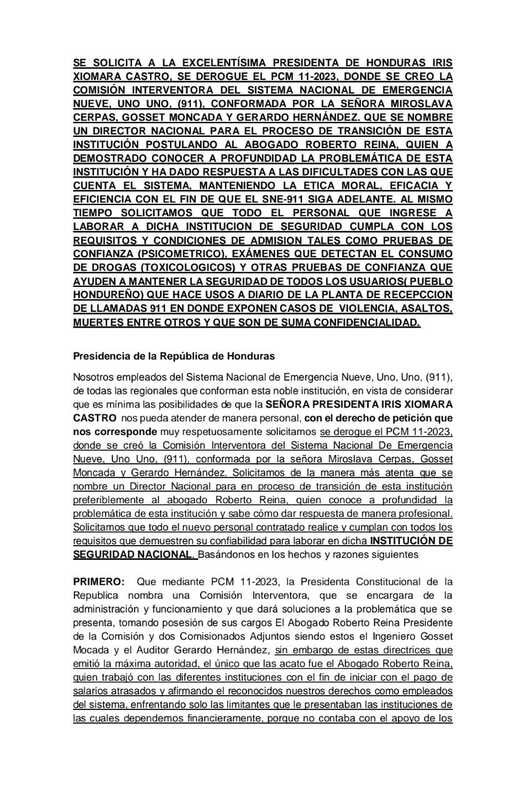 «Se solicita a la presidenta, Iris Xiomara Castro, se derogue el PCM 11-2023, donde se creó la Comisión Interventora del Sistema Nacional de Emergencia», indica el escrito.