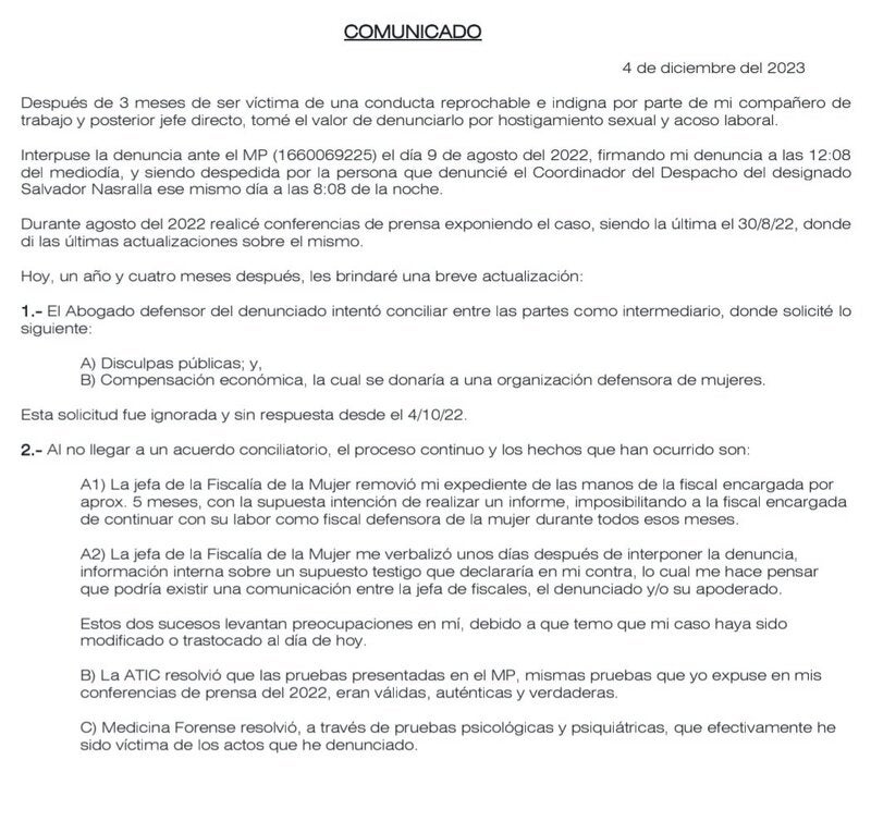En ese sentido, la arquitecta emitió un comunicado donde afirmó que durante tres meses fue víctima de acoso sexual y laboral. Lamentó que su denuncia tiene 16 meses y no ha tenido respuesta alguna de las autoridades.