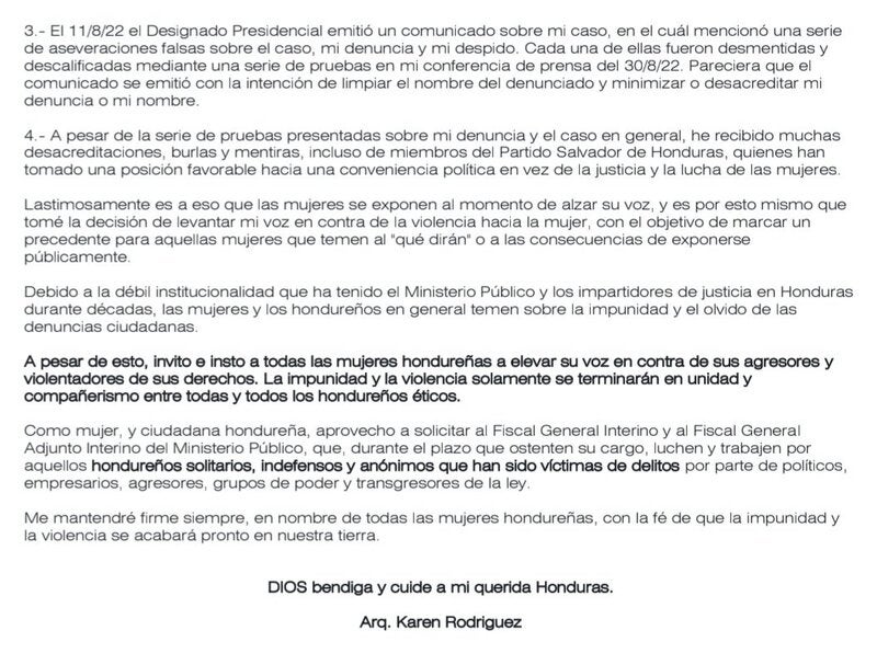 «A pesar de la serie de pruebas presentadas sobre mi denuncia y el caso en general, he recibido muchas desacreditaciones, burlas y mentiras, incluso de miembros del Partido Salvador de Honduras. Quienes han tomado una posición favorable hacia una conveniencia política en vez de la justicia y la lucha de las mujeres», escribió.
