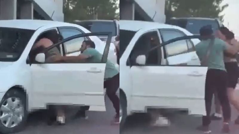 La situación escala rápidamente. En otra parte del clip se observa al hombre implicado intentar contener a la furiosa fémina, jalándola con fuerza. En medio del forcejeo, una menor de edad, presuntamente hija de alguno de los involucrados, cae al suelo desde el interior del carro.
