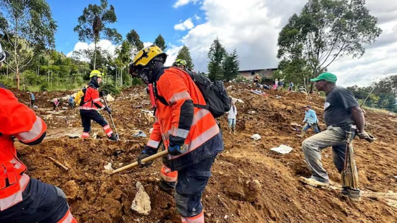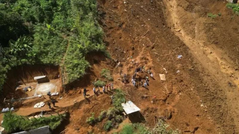 Los rescatistas escarban entre toneladas de tierra para encontrar sobrevivientes o cuerpos de víctimas en una montaña. Fuertes lluvias que desbordaron una quebrada cercana causaron el derrumbe.