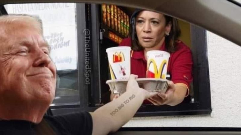 La creativad de los cibernautas superó los limites de la imaginación con ediciones en las que muestran a su contrincante, Kamala Harris, ser «despedida» de su empleo. Otros también aprovecharon la oportunidad para recordar una de las acciones de Trump previo a su triunfo, el que estuvo sirviendo comida rápida en una de las cadenas de comida más populares de este país.