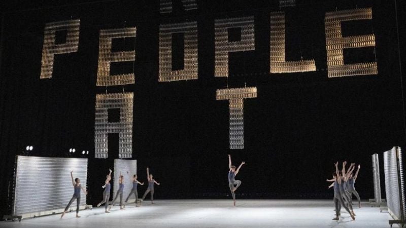 Los bailarines del espectáculo «Plastic» se mueven en la escena con tutús creados a partir de empaques de burbuja. Durante el espectáculo, usan paraguas transparentes que abandonaron y giran con gracia entre gigantescos muros de botellas recicladas.