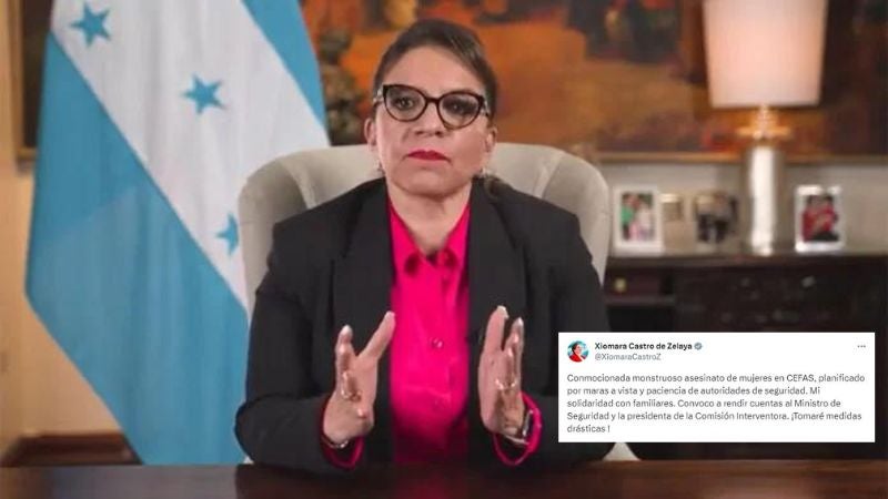 «Conmocionada, monstruoso asesinato de mujeres en CEFAS, planificado por maras a vista y paciencia de autoridades de Seguridad. Mi solidaridad con familiares. Convoco a rendir cuentas al Ministro de Seguridad y la presidenta de la Comisión Interventora. ¡Tomaré medidas drásticas!», escribió la mandataria a través de su cuenta oficial de Twitter.